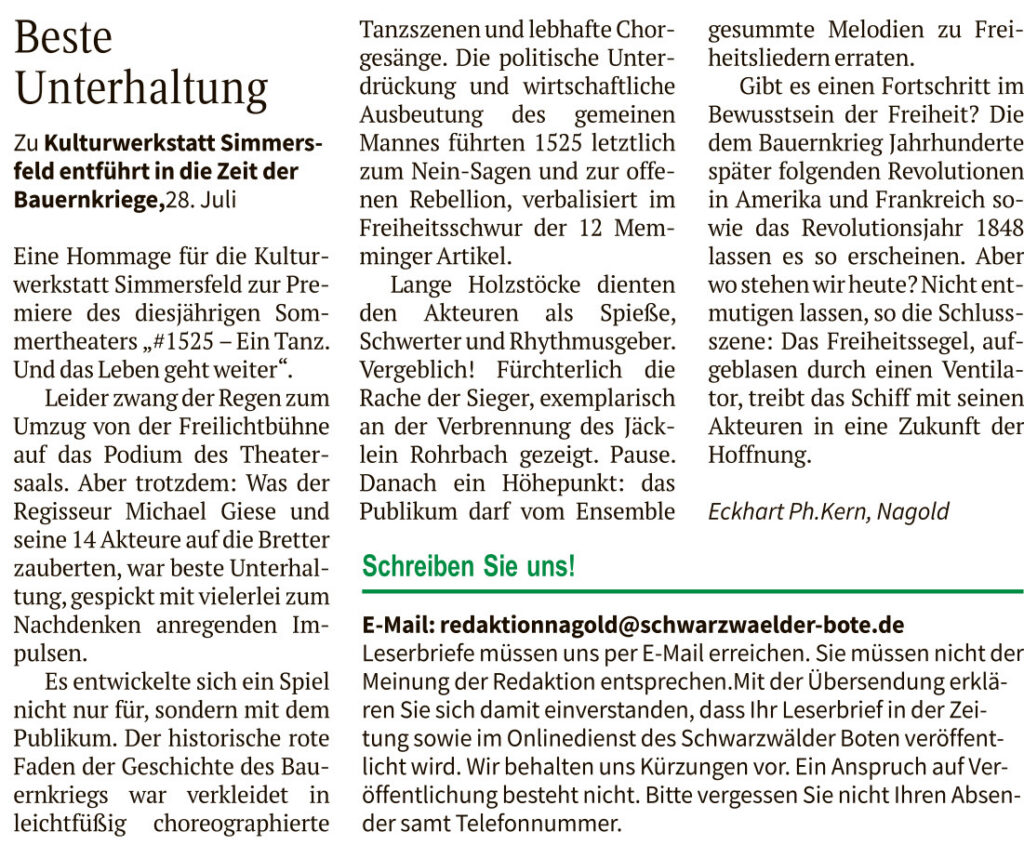 500 Jahre Aufbegehren des sogenannten Dritten Standes im Süden Deutschlands und Thüringen, auch bekannt als: DER BAUERNKRIEG! Das machen die Simmersfelder*innen 2025 zum Thema. Und das in eher ungewohnter Form. Es wird getanzt und gespielt. Sie zeigen die Armut, die Unfreiheit und die unverhohlene Ausbeutung durch Obrigkeit und Klerus. Harte Techno-Beats, bekannte Lieder des Widerstands aus 500 Jahren und blitzlichtartige Szenen zwischendrin aus der Zeit des damaligen Aufruhrs, das alles macht den Abend für die Zuschauer zu einem bunten Strauß von Bildern. Mit viel Musik.