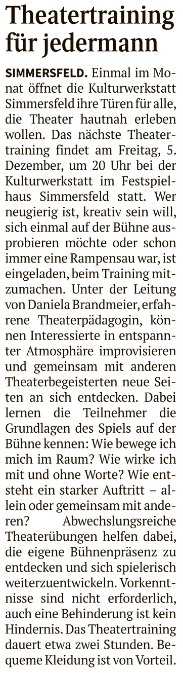 Simmersfeld. Einmal im Monat öffnet die Kulturwerkstatt Simmersfeld ihre Türen für alle, die Theater hautnah erleben wollen.