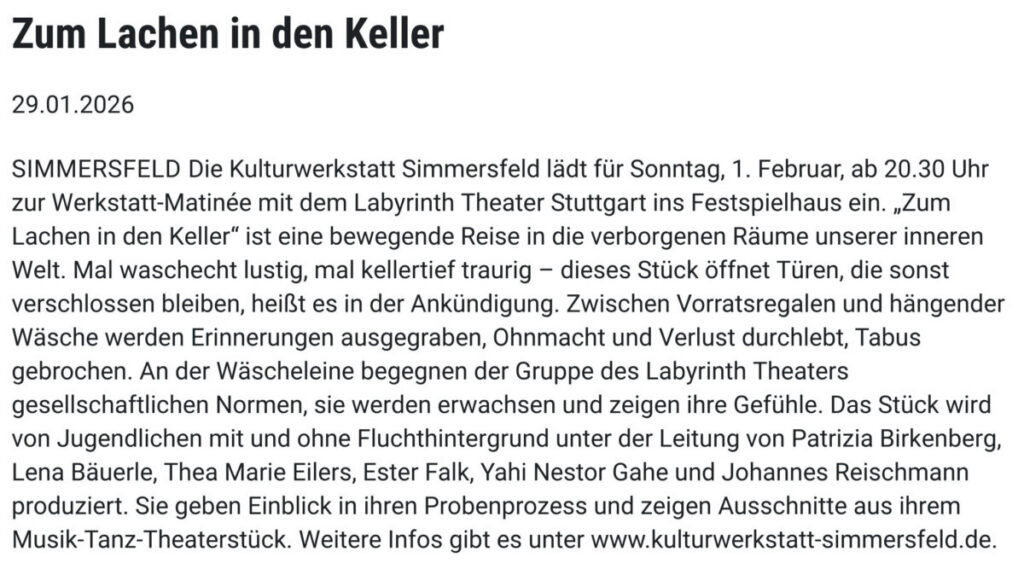 SIMMERSFELD Die Kulturwerkstatt Simmersfeld lädt für Sonntag, 1. Februar, ab 20.30 Uhr zur Werkstatt-Matinée mit dem Labyrinth Theater Stuttgart ins Festspielhaus ein.